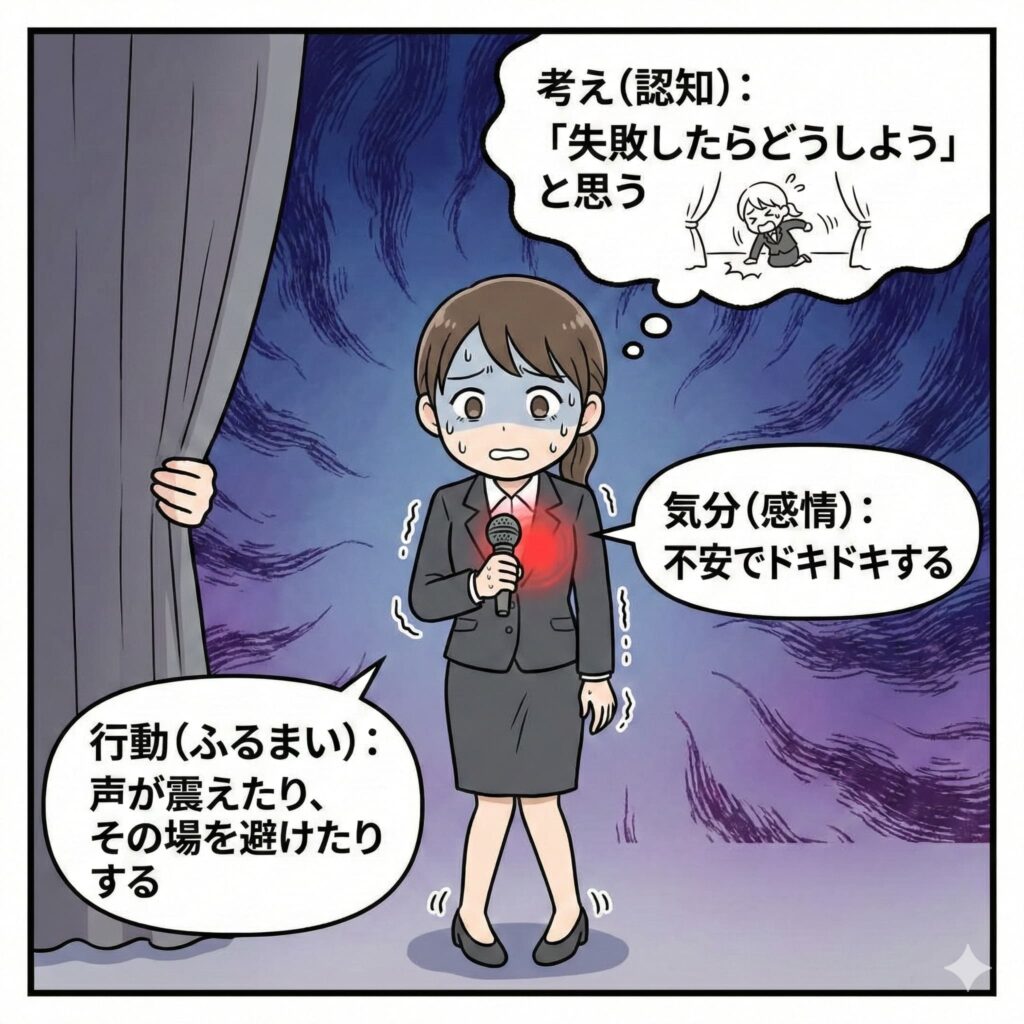 - 考え(認知): 「失敗したらどうしよう」と思う